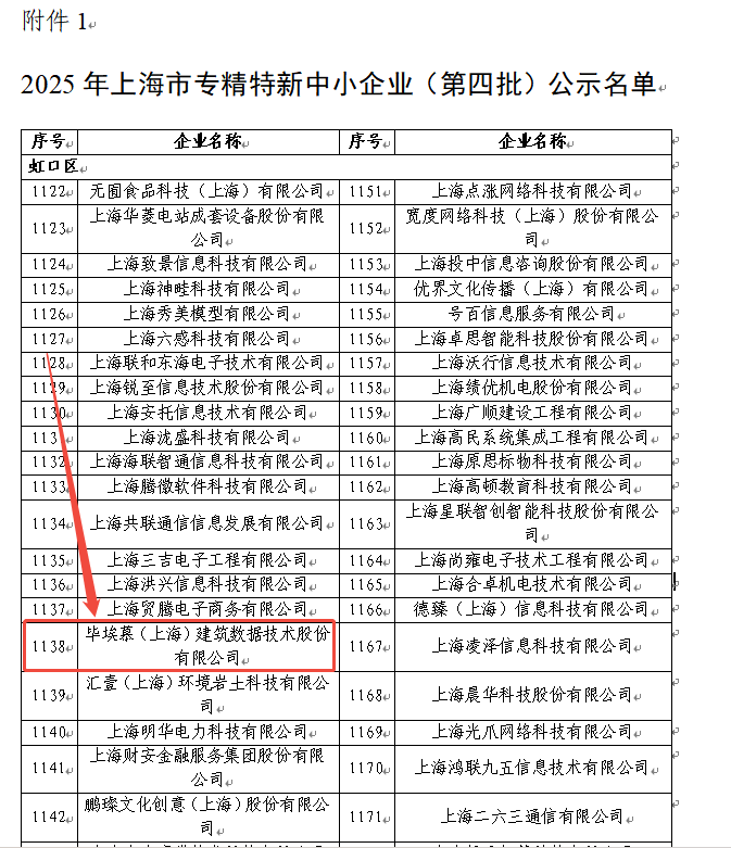 近日,上海市经济和信息化委员会正式公布2025年度上海市专精特新中小企业认定名单,毕埃慕(上海)建筑数据技术股份有限公司凭借在建筑数字化领域的专业深耕、技术创新、产品特色与高质量发展,成功通过严格评审,荣获上海市“专精特新中小企业”认证。这一荣誉不仅是对公司技术实力与行业价值的权威认可,更是毕埃慕在建筑数据与BIM全生命周期服务赛道上持续领跑的重要里程碑。