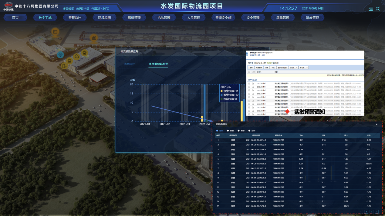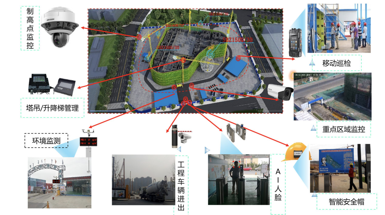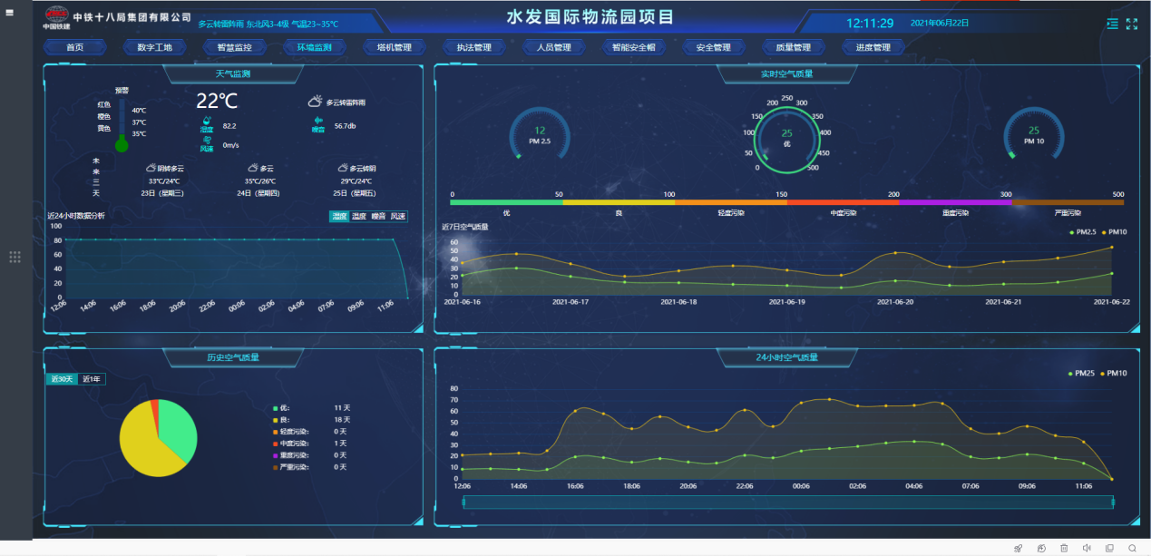 在现场相应位置设置传感器,在实时监测工地现场的噪音污染、扬尘污染的同时,监测施工现场温度、湿度、风力等环境参数。可及时发现环境变化因素,为施工作业班组预警,避免在恶劣环境下施工,减少事故隐患,提升施工质量。