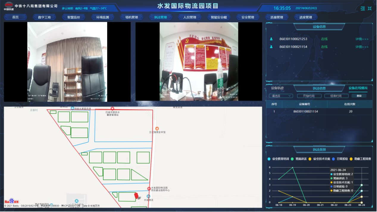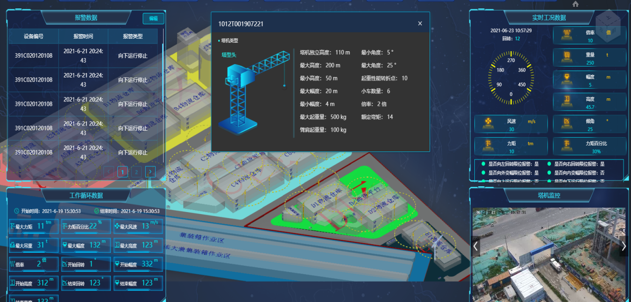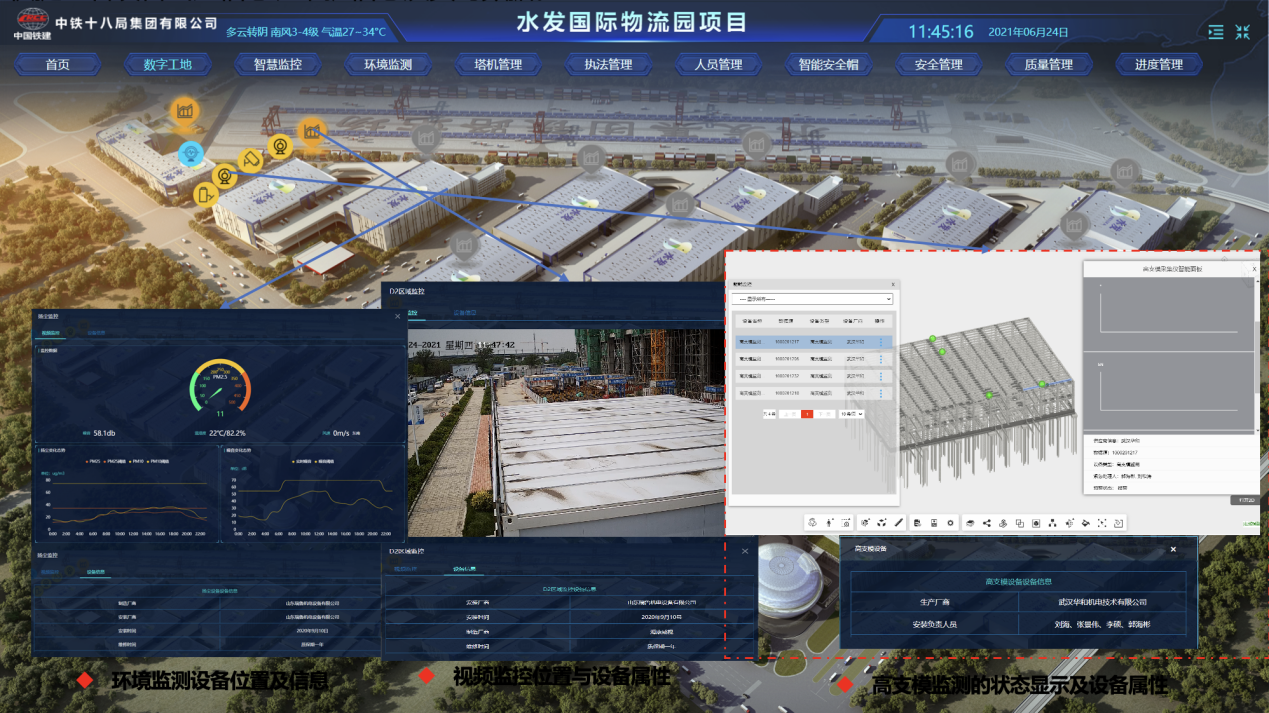 驾驶舱将以图标直观的方式将现场设备(比如:环境监测设备、视频监控设备及高支模设备)的点位与状态布置在图中,方便快捷查看设备出厂信息、维护信息及实时数据。