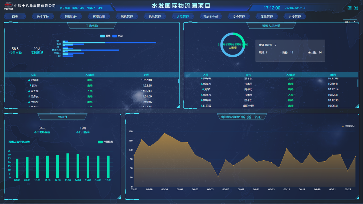 人员管理与劳务实名制结合,通过人脸识别来获取施工人员及管理人员的考勤信息。减少不必要的人员纠纷问题。信息实时更新,使人员管理更加高效。受新冠疫情影响,项目复工复产遇到了挑战。项目积极推行信息化人员管理手段,针对每位施工人员每天填写进出场记录、自动测温并形成人员信息大数据,保证了施工人员组织及健康,进而保证了施工工期。