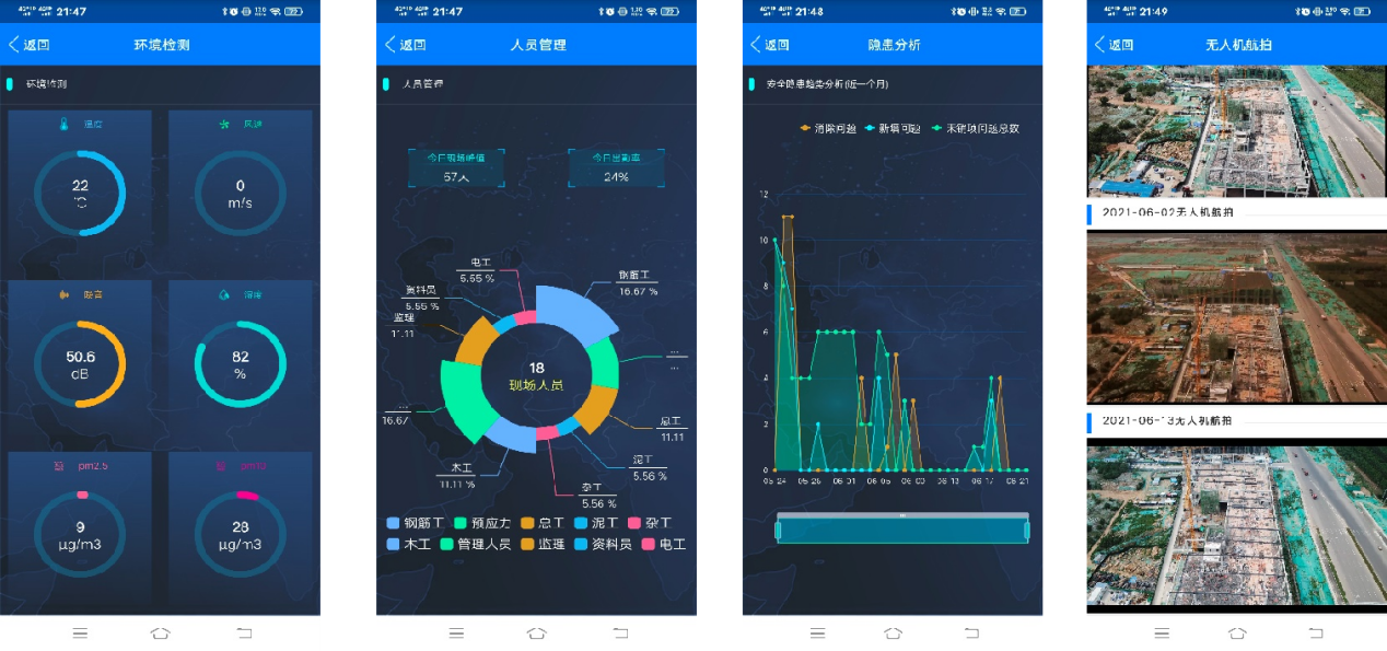 在现场工作产生的各种生产数据均可实时在驾驶舱模块的相应图表中进行呈现。根据现场管理所需从后端数据库中抓取相关数据,同步到移动端管理界面进行随时随地查询。