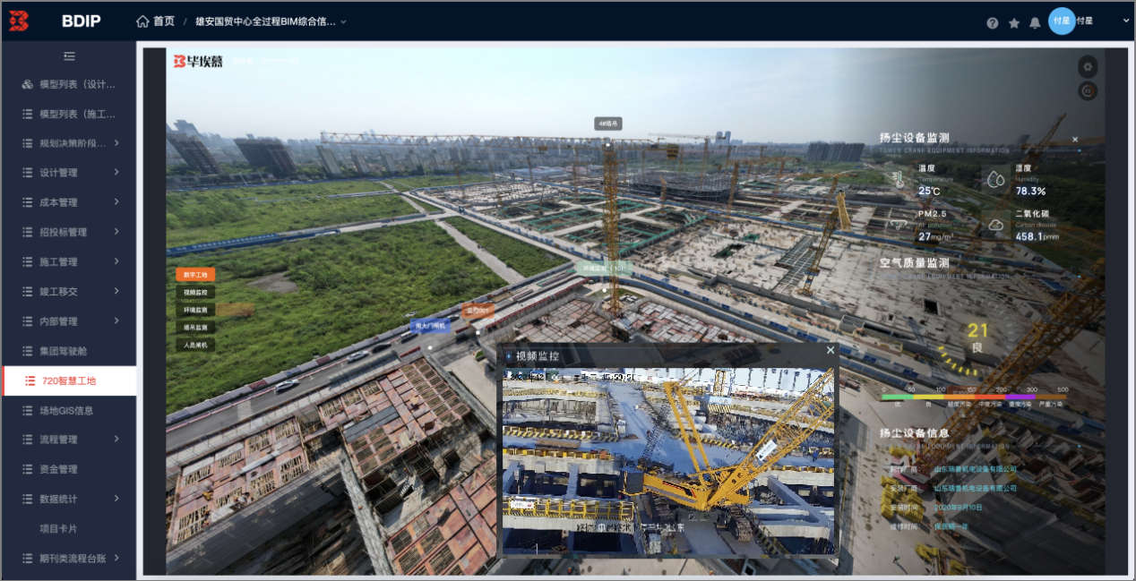 平台支持720全景视图智慧工地看板功能。除了可以链接AI监控、塔吊监测、人员闸机、环境监测设备并同步显示实时数据外,还可以关联平台各类施工管理业务,例如安全巡检问题记录、施工进度报告、产值报告等,没有BIM也可以实现可视化的建设全过程可视化智慧工地管理。